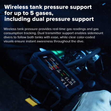 Wireless tank pressure tracking gives divers real-time gas readings and consumption data at a glance. Dual transmitter support makes it easy for sidemount divers to follow both tanks simultaneously, while clear, color-coded visuals keep you instantly informed throughout the dive.